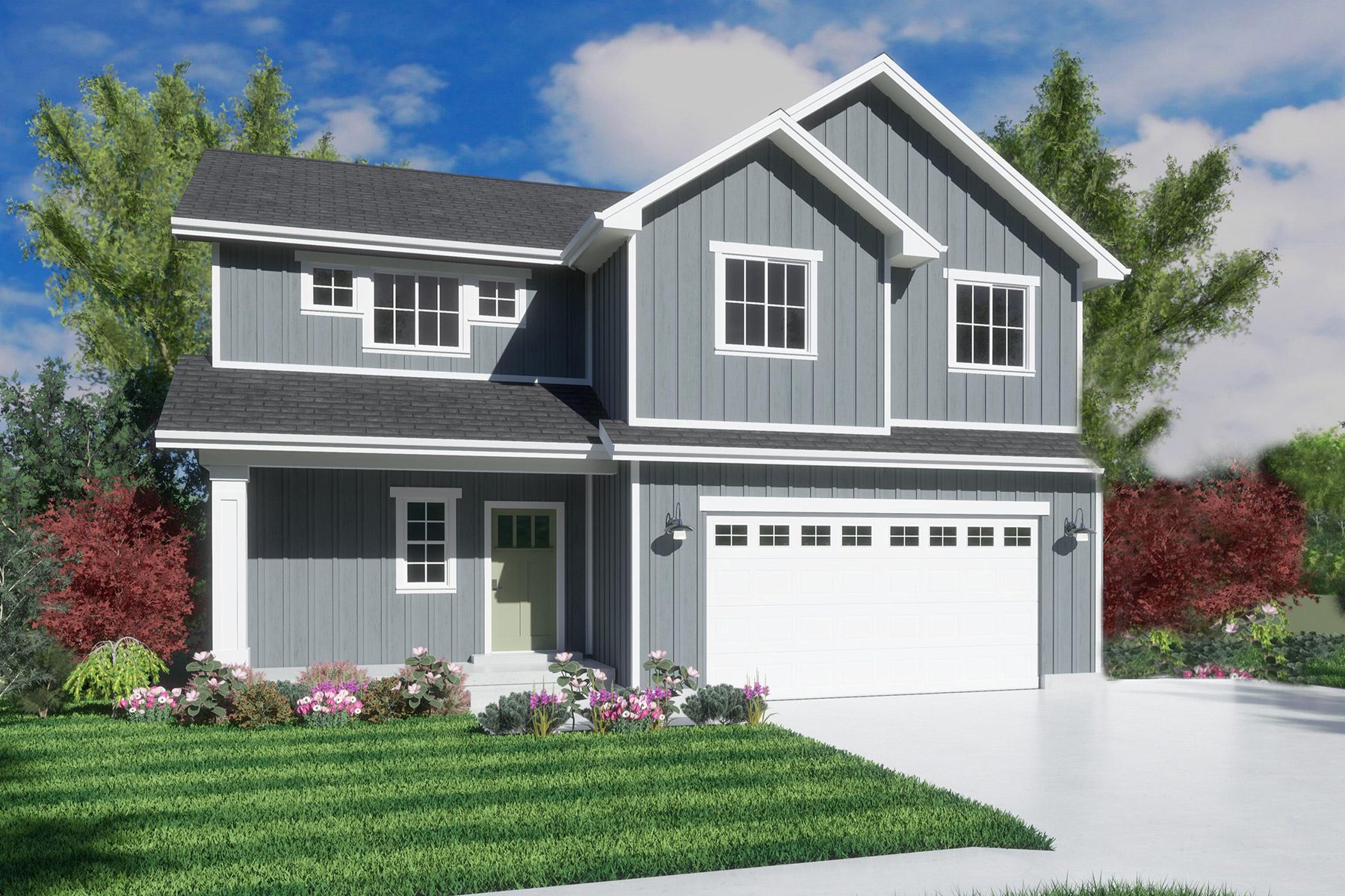 The Harrison two-story home is 2,822 square feet and has 4 bedrooms, 2.5 baths, and a 3-car garage. This beautiful two-story home has a light and airy entry with an open staircase to the second floor. Just beyond the foyer is a coat closet and half bath, and then an open concept living area that includes a large great room, dining room, and kitchen. The dining room has the option for a bay window or a bay with French doors, and the kitchen features a large pantry and has the option for an island. You can also enter the garage just off the kitchen. Upstairs on the second floor is the master bedroom, plus three other bedrooms and an open loft area. The large master bedroom has and an attached master bathroom that has a toilet room, two single vanities, a soaker tub, shower, and entrance into an expansive walk-in closet. The other three rooms each have standard-sized closets with upper shelving for storage and are the perfect space for kids rooms or an office. The large main bathroom has a typical vanity and bathtub. The unfinished basement provides plenty of storage space and allows for growth. There’s room for an optional future family room, another bedroom, and a full bathroom. * See agent for details on 3rd Car Garage